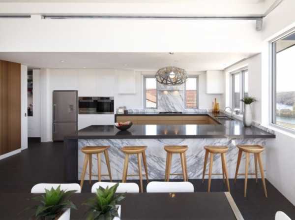 Расположенная в центре кухни барная стойка служит не только по своему прямому предназначению, но и создаёт необычный современный интерьер. Такой вариант подойдёт только для большого по площади помещения.