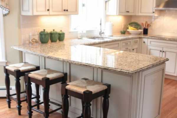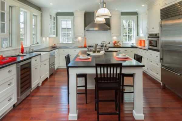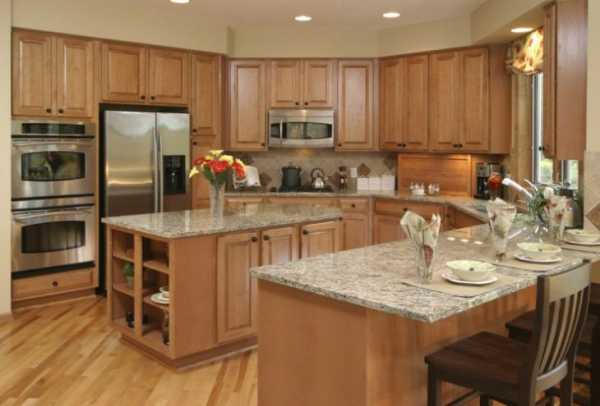 - если помещение просторное и широкое – от 15 м2 – можно установить посередине П-образного гарнитура островной элемент – несколько напольных шкафов со столешницей, которую можно использовать в качестве дополнительной рабочей зоны и как обеденный стол, барную стойку и т.п.;