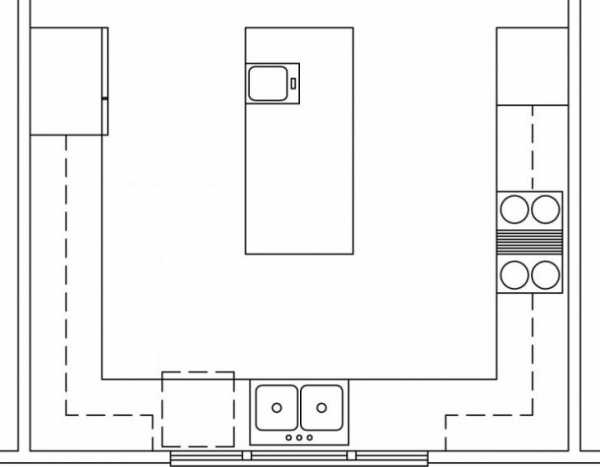 Это универсальная планировка, которая подходит и для просторных, и для относительно небольших помещений. Исключение составляют узкие – менее 2,5 метров, в которых такая планировка создаст вместо экономии пространства дополнительные неудобства, сделав работу в рабочей зоне не комфортной и медленной.