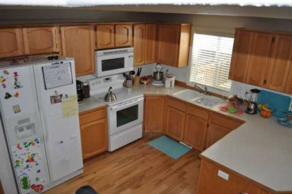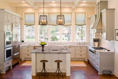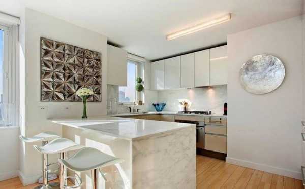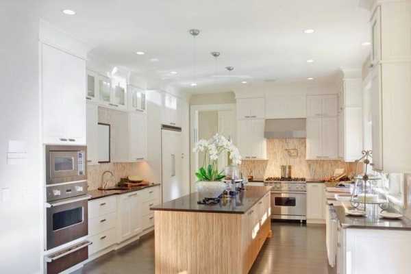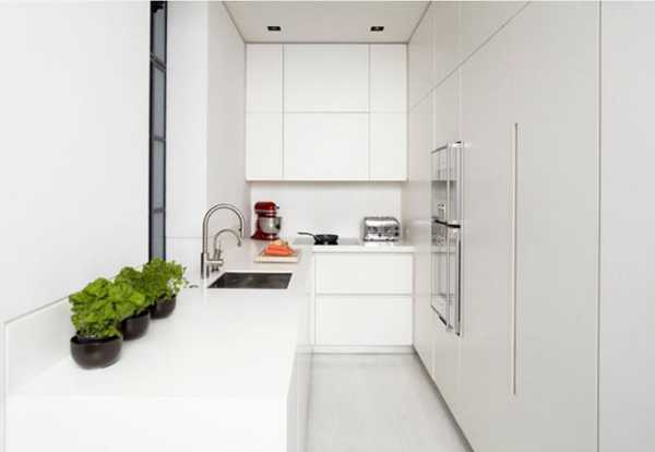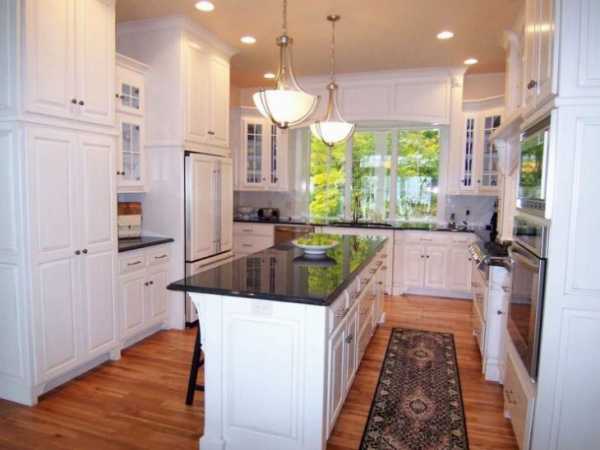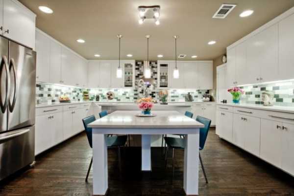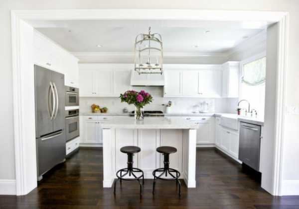Если сделать основные шкафы белыми, то помещение будет смотреться просто огромным. Но в этом случае, надо будет разбавлять белизну цветным текстилем или ярким фартуком над рабочей зоной.