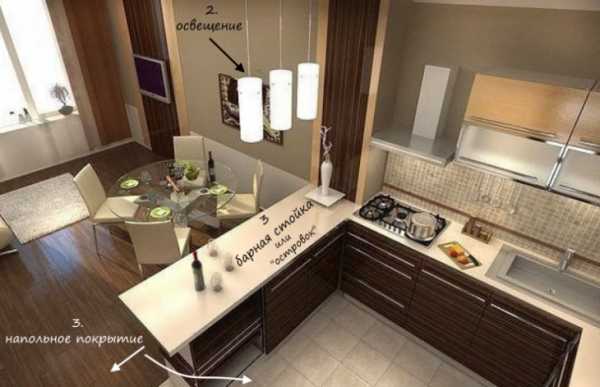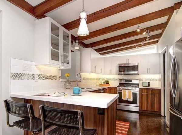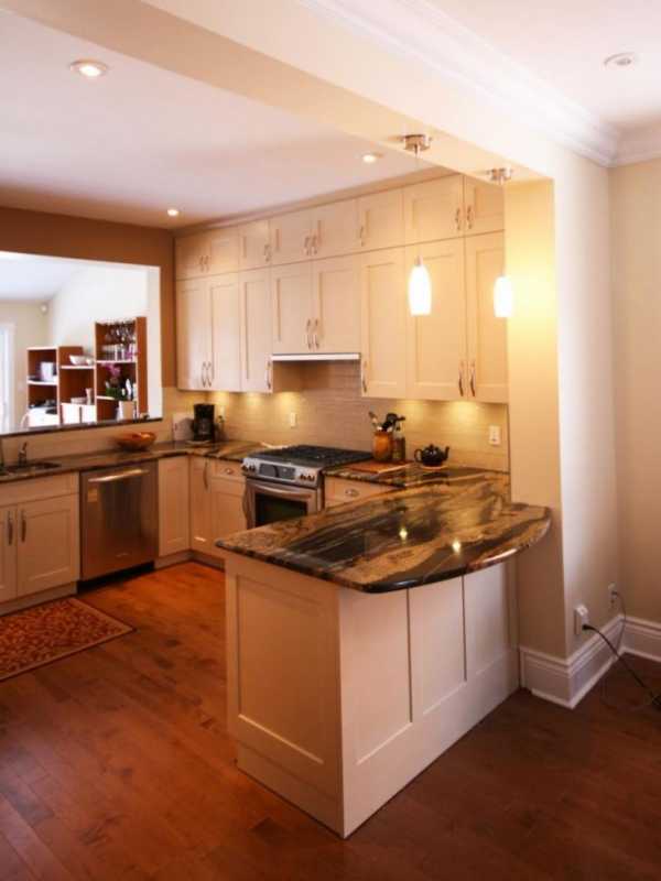 В малогабаритных кухнях такая планировка встречается редко. Обеденную зону в таких случаях приходится выносить за пределы помещения. Другой вариант — использование барной стойки вместо обеденного стола.