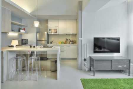 Исключение составляют только квартиры-студии, где кухня не предназначена для приёма пищи, а значит, нет необходимости там размещать стол со стульями (он в этом случае, находится в гостиной), а это, в свою очередь означает, что для готовки будет достаточно совсем небольшого пространства.