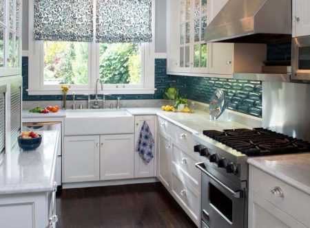 Не стоит «выносить» мойку к окну. Как бы ни красиво это смотрелось в американских фильмах, учитывайте, что у них высота и ширина окон — немного другая. И за счёт этого, брызги не попадают на стекло, не достают. Если же, в случае типовой квартиры, взять и поднять окно, дабы обустроить под ним мини-фартук, то оно будет куда меньше, чем надо и естественное освещение кухни выйдет мрачноватое.
