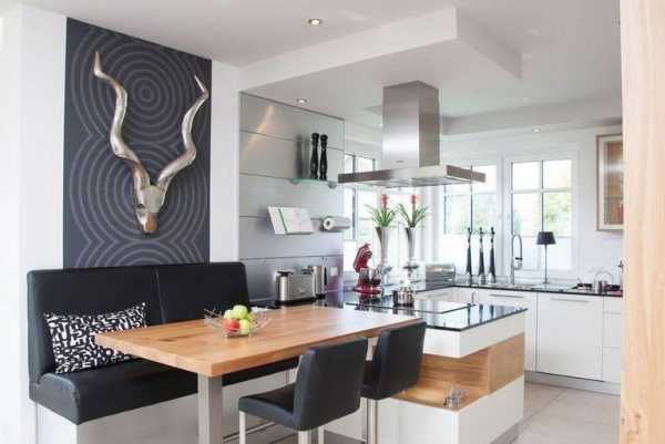 Очень интересно смотрятся трёхсторонние кухни, если к краю одной из сторон поставить угловой диван с обеденным столом.