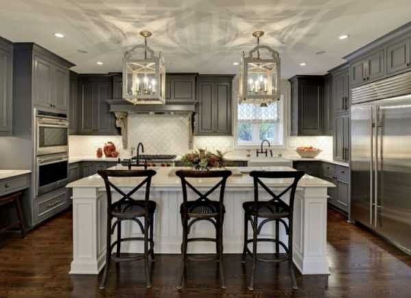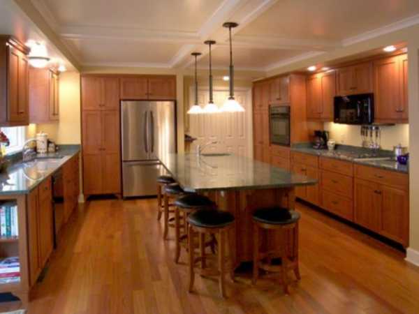 Такая планировка подходит для очень больших кухонных помещений, площадь которых превышает 20 квадратных метров. Остров нужен для того, чтобы заполнить пустоту в центре. Его можно использовать как обеденную зону или как рабочую поверхность. Чтобы остров смотрелся органично и не мешал, расстояние в окружности вокруг него должно быть не меньше полутора метров.