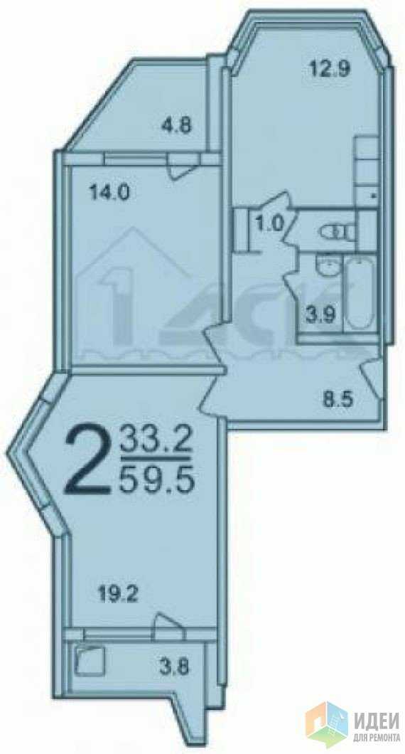 Схема 97 серии бывает двух видов планировок: с кухней 8,69 кв. м, и кухней 13,66. Преимущества: лоджии по 5 кв. м и раздельные ванная и туалет.