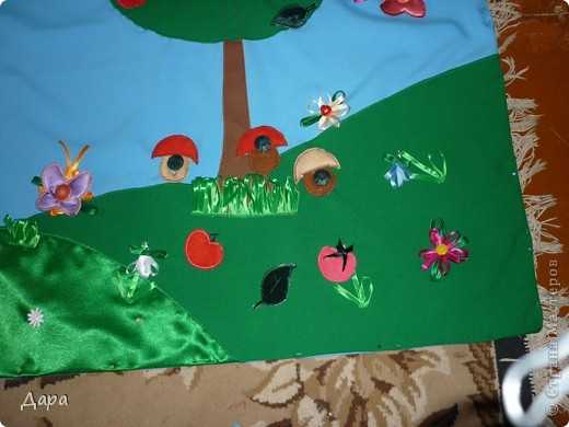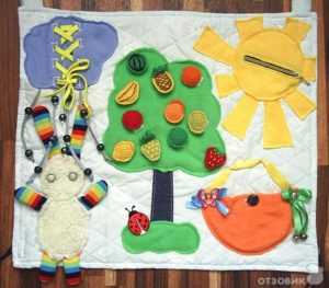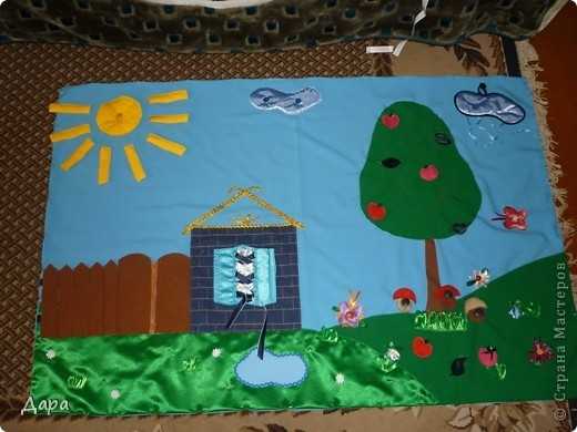 Это может быть коврик, панно, кукольный театр и даже объёмная книжка. Объединённые общим сюжетом аппликации, кармашки, нашивки декорируются такими полезными для развития моторики пальцев пуговичками, молниями, липучками и кнопками.
