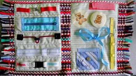Эту игрушку можно выполнять в разнообразных формах: в виде развивающего коврика, панно, мягкой книжки или подушки. Здесь вы можете дать волю фантазии и придумать что-то своё. Но чаще всего она делается в виде коврика. Суть в том, чтобы дать ребёнку максимально разнообразные тактильные ощущения, а также учить его выполнять действия, развивающие мелкую моторику.