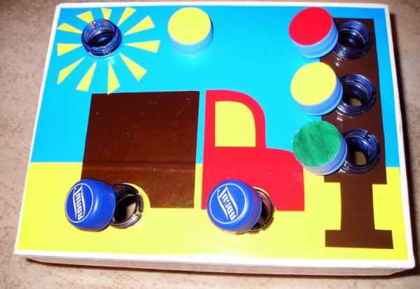 Для того чтобы сделать развивающую игрушку, понадобятся: коробка от обуви, обрезанные горлышки от бутылок с крышками, цветная бумага.