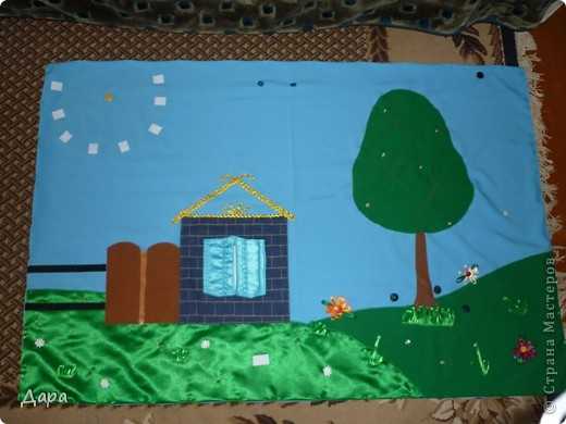 Панно для детского сада, полностью оформленное. Для работы исполь зованы ткани разных фактур — габардин, флис, атлас, креп-сатин, драп, трикотаж. Размер 1мх1,5м
