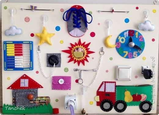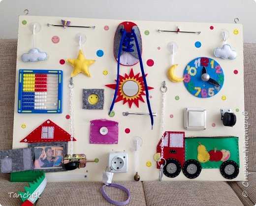 - Бизиборд. Его Вы можете изготовить самостоятельно, прикрутив к доске множество замочков, выключателей и задвижек, либо приобрести уже готовый. Например, здесь. Многих малышей затягивает подобная деятельность надолго!