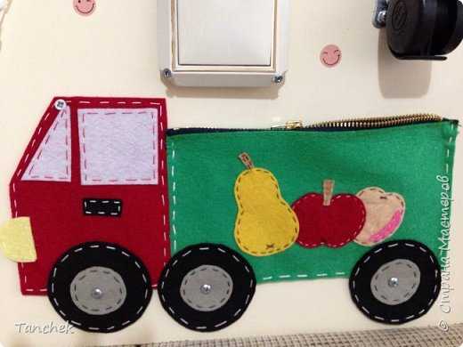Машина-кошелек. Учимся открывать/закрывать молнию, а внутрь можно положить мелкие предметы. Также выключатель, который особенно привлекает малышей и колесико для игры