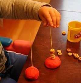 А если вставить спагетти в куски теста, то выйдет крутая игрушка с нанизыванием предметов:
