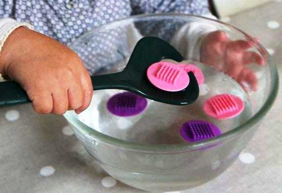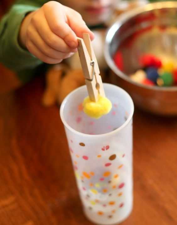 Как вариант можно воспользоваться стаканом-непроливайкой и проталкивать в него помпоны или пуговицы. Главное, находитесь во время игры всегда рядом с крохой, чтобы он ненароком не проглотил бусинку или пуговицу.