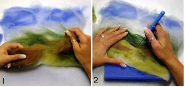Теперь на фон надо добавлять детали картины: деревья, цветы, камни и т.д. Сухими руками (к мокрым шерсть прилипает) выкладываем стволы деревьев, кустов, камни. По новым деталях хорошо проходим иглой, смачиваем, уминаем руками. Затем используют более жесткие средства — деревянную скалку. Влажную картину аккуратно туда-сюда проходим деревянной скалкой.