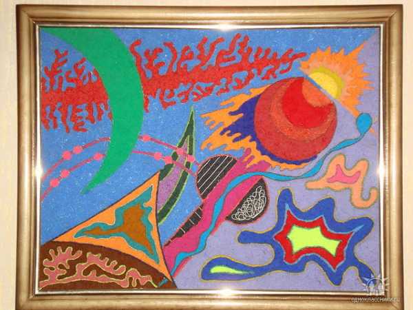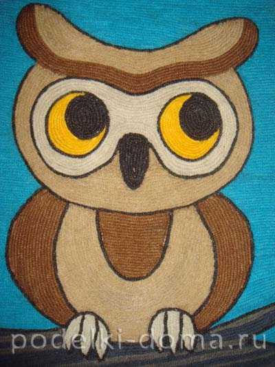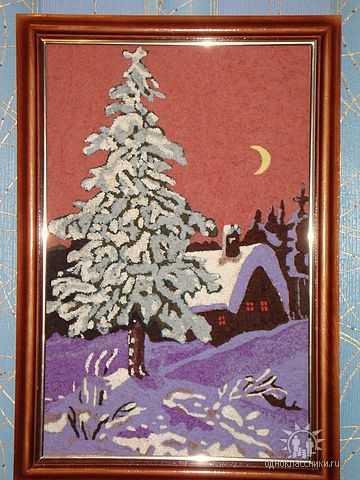 Для такой техники создания панно нужно очень мелко нарезать нитки, которые будут использоваться при работе. Следует помнить, что чем более мелкими будут кусочки нитей, тем красивее и равномерней получится результат. Принцип создания такой же, как описано выше. На картон наносится рисунок, делаются основные контуры контрастными цветами, а все остальное пространство, с помощью ниток и клея, заполняется кусочками нитей. Конечно создание панно потребует терпения и усидчивости, но результат очень будет похож на настоящую картину.