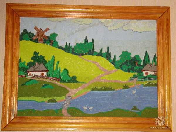 Слова Юрия:»Мною придуман способ изготовления картин (пока что природы) путем нарезания как можно мелче разноцветных ниток из самого различного материала и нанесения их согласно схемы на лист ДВП. Этой техникой я уже дошел даже до нанесения оттенков. Занимаюсь эти лет семь. Инструмент, который при этом используеться: ножницы, клей ПВА, деревянная зубочистка и талант. Элементарно просто и картины получаються довольно красивые, которые на расстоянии, примерно 1-1,5м, нельзя отличить от тех которые написаны маслом. Мне инретресно знать, есть по этому способу творчества у меня коллеги?»
