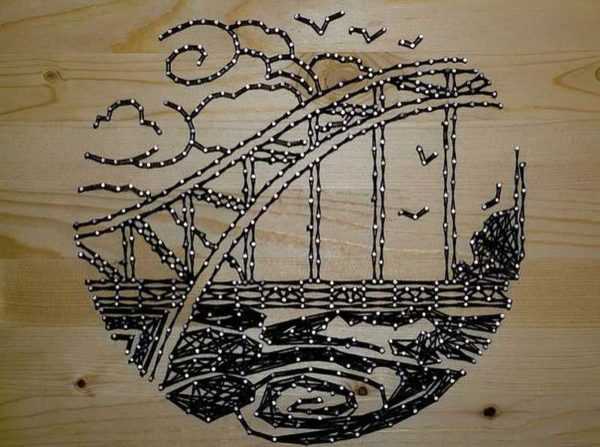 Такая техника — способ нарисовать пейзаж при помощи гвоздей и ниток. Нужно особое видение, которое позволяющее разбить картинку на линии, которые в общем создадут цельное изображение.
