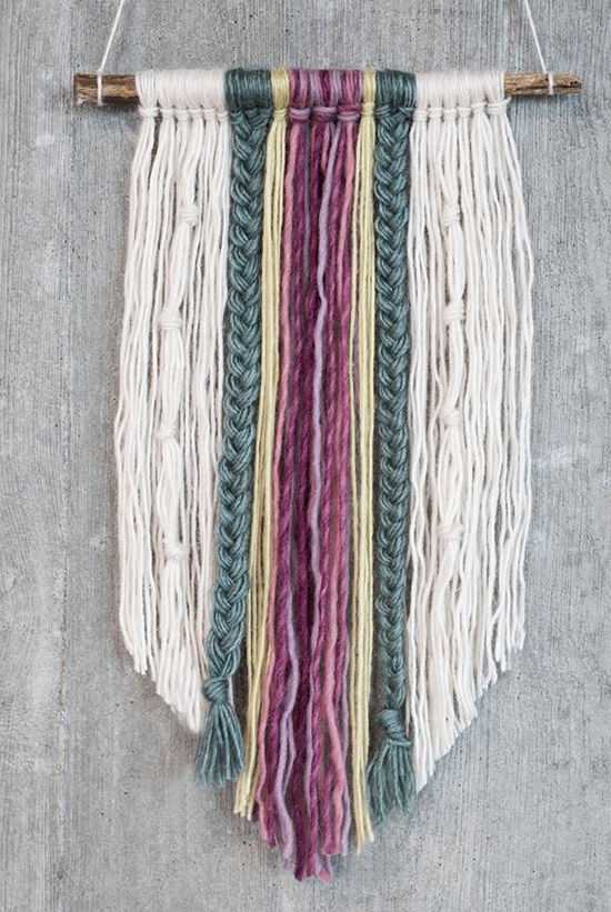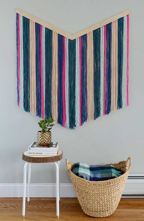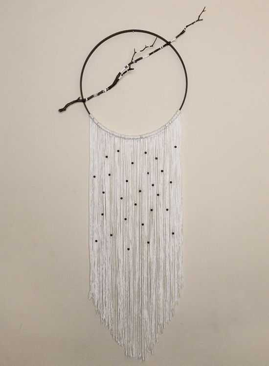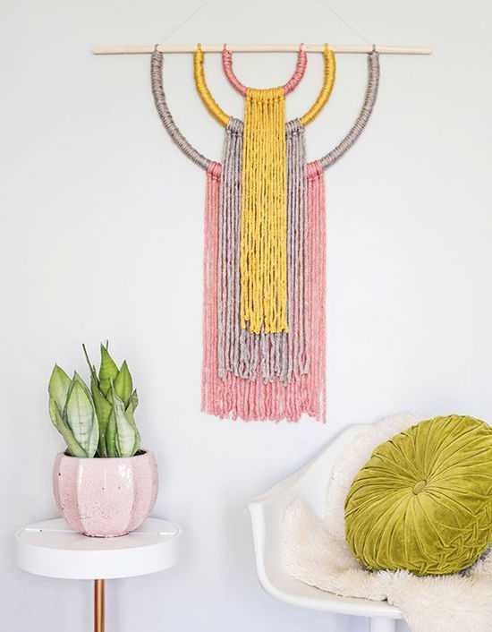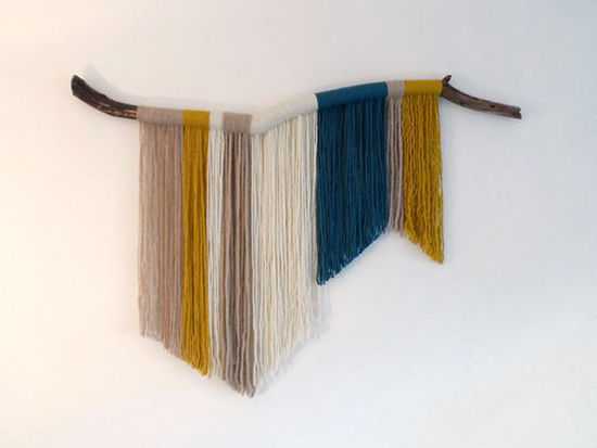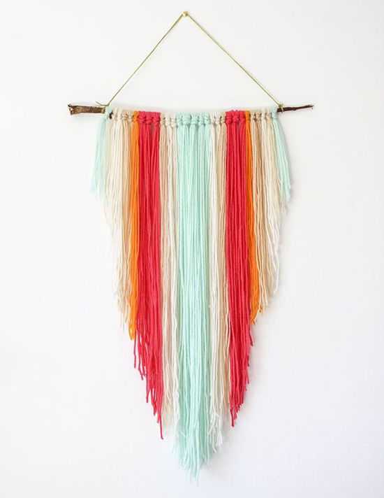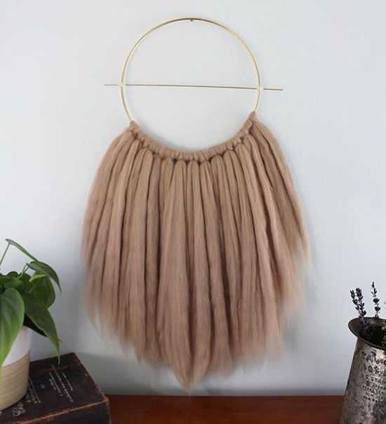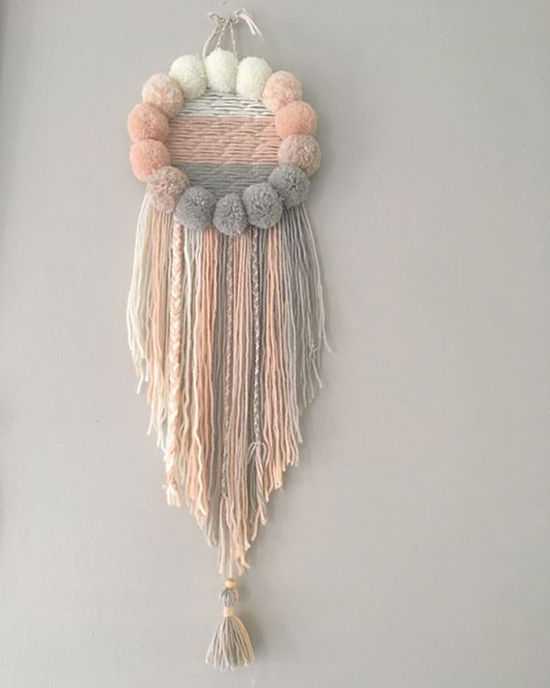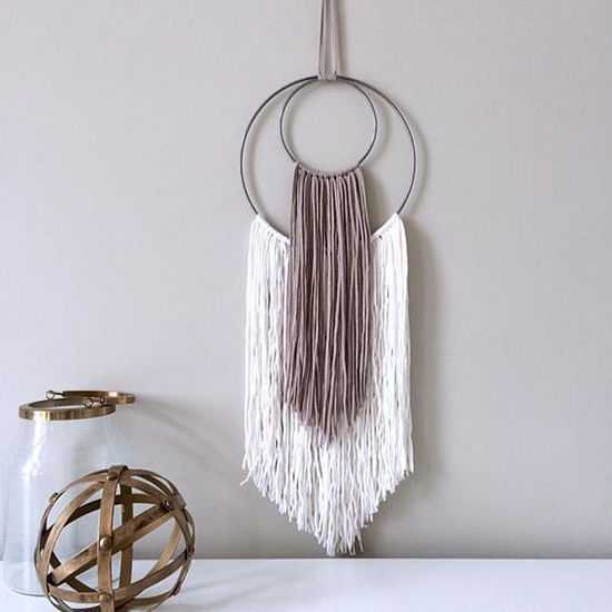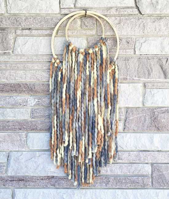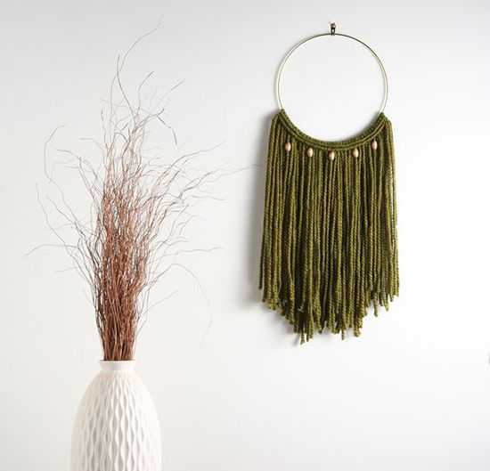 Объемная пряжа, ровница или даже гребенная лента, природные цвета, омбре, элементы ручного ткачества и узлы макраме, модные кисти, косы, минималистичные обручи, ветви деревьев, перья, помпоны — простая альтернатива картинам, коврам и ловцам снов. Сделать такое получится быстро и весело: