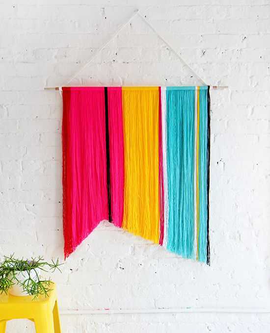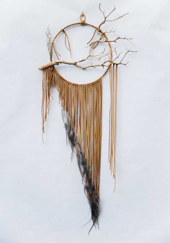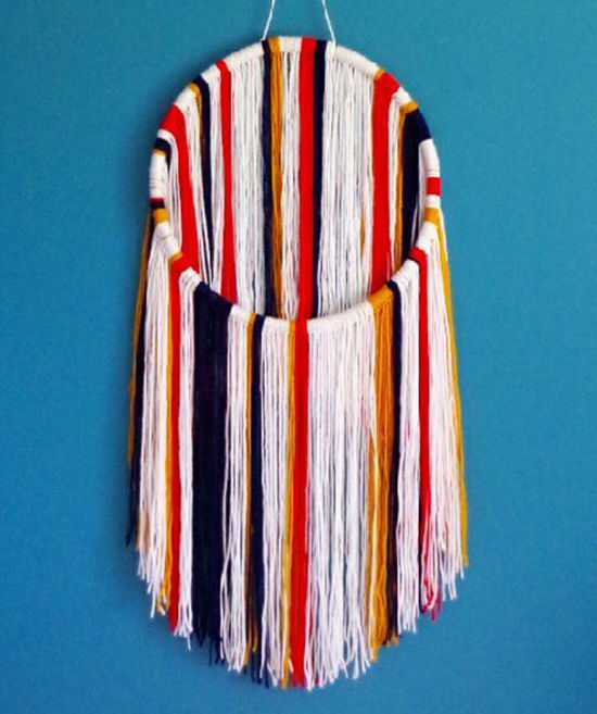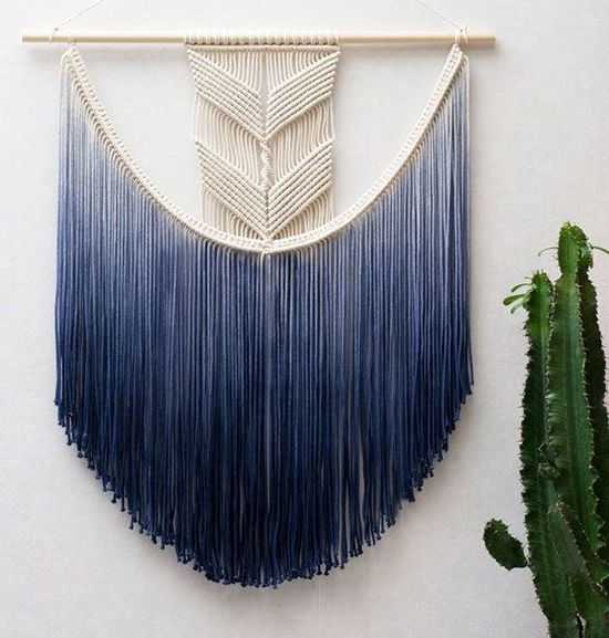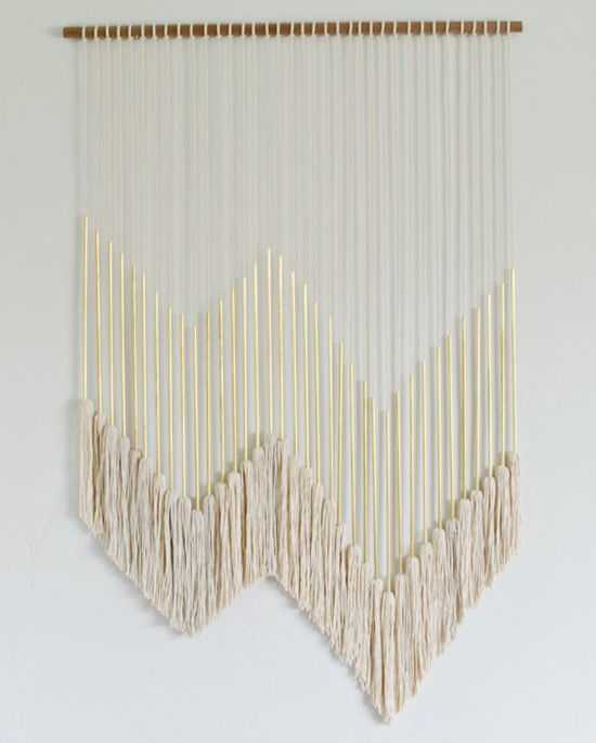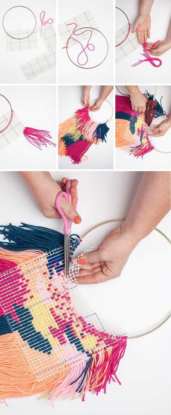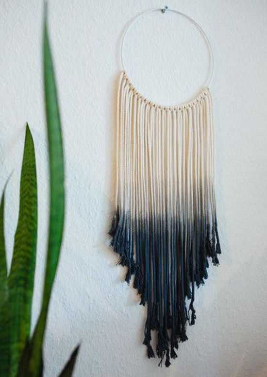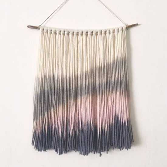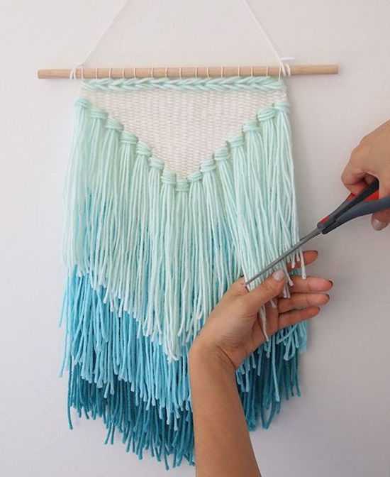 Объемная пряжа, ровница или даже гребенная лента, природные цвета, омбре, элементы ручного ткачества и узлы макраме, модные кисти, косы, минималистичные обручи, ветви деревьев, перья, помпоны — простая альтернатива картинам, коврам и ловцам снов. Сделать такое получится быстро и весело: