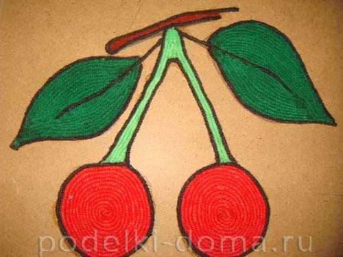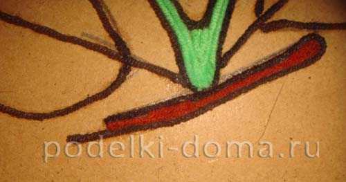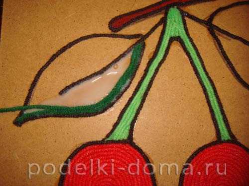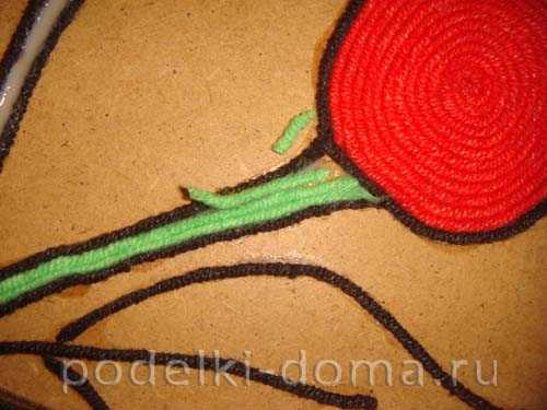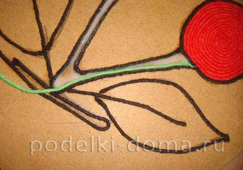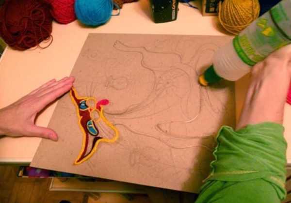 По нарисованному контуру аккуратно, точно следуя по линии, приклеить нитки темного цвета. Внутреннюю часть рисунка и основной фон хорошо промазываем клеем и заполняем нитями согласно ранее определенной цветовой палитре. При необходимости отдельные элементы можно поправить с помощью зубочистки.
