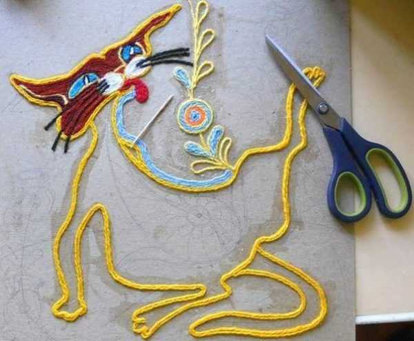 - Образовавшиеся контуры заполняются нитками. Можно проклеить основу, уложить на клей сухую нитку, можно смочить клеем нитку и выложить ее на сухое основание. Хорошо смотрится заполнение по спирали. Этот способ хорош, если это часть корпуса, фон или другой подобный объект. Второй способ — отрезки ниток требуемой длины, которые укладываются вдоль одной из граней. Этот способ применяется когда важно направление нити – для прорисовки рельефа, направления шерсти и т.д.