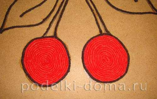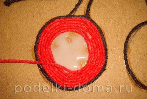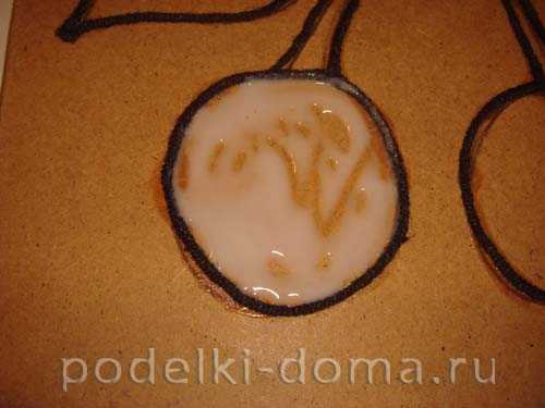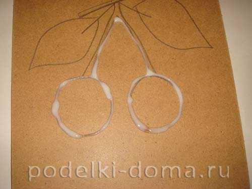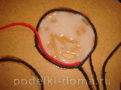 - Контур промазывается клеем ПВА, на него приклеивается нитка требуемого цвета. В некоторых вариантах она контрастная (черная, например), в других — в тон детали.