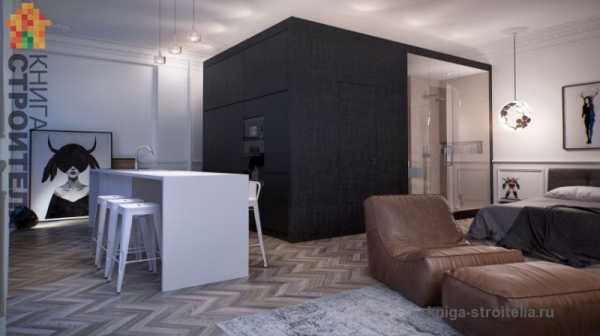Квартира студия с лепкой в классическом стиле, мебелью хай тек и предметами декора соответствующими арт стилю примечательна неординарной комнатой – кубом установленным практически в центре комнаты. Своеобразный куб является сложной конструкцией включающей в себя встроенную кухню, прихожую, гардеробную и санузел с туалетом, умывальником и душевой кабиной. (Рис. 8)