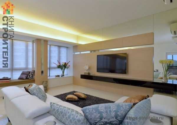 Кроме неординарного зонирования комнаты здесь присутствуют и интересные детали отделки, и предметы мебели. Им так же будет уделено внимание в тексте данной статьи.