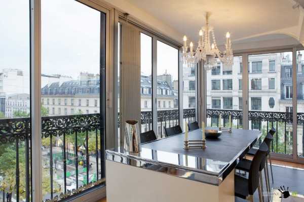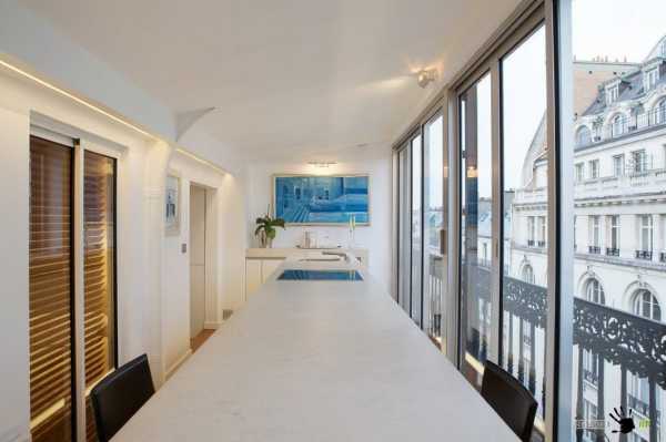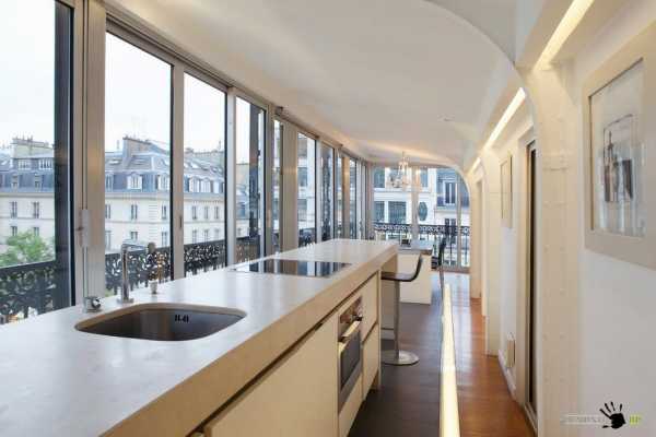 Небольшая квартира в Париже располагается на верхнем этаже старинного здания. Этот факт позволяет несколько усилить проявления преимуществ ее панорамных окон.