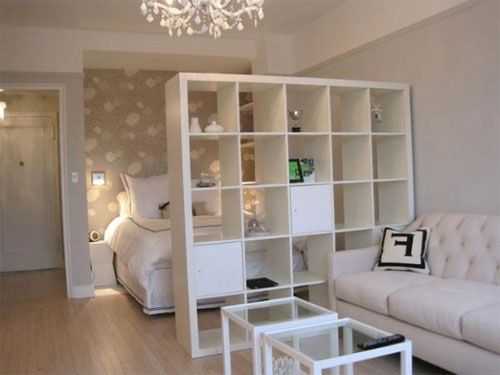 Оригинальная перегородка в дизайне помещения.- Подбирая мебель для гостиной-спальни в одной комнате, лучше остановиться на многофункциональной мелкогабаритной мебели. Наличие в ней потайных отсеков позволит вам освободить максимум пространства в помещении.