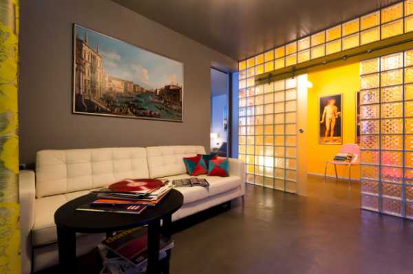 Перегородки из стеклоблоков тоже могут выглядеть красиво и современно. Внутренняя стенка из стеклянных «кубиков» — это устойчивая и прочная конструкция, столь же долговечная, как и кирпичная кладка.