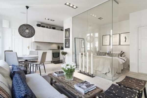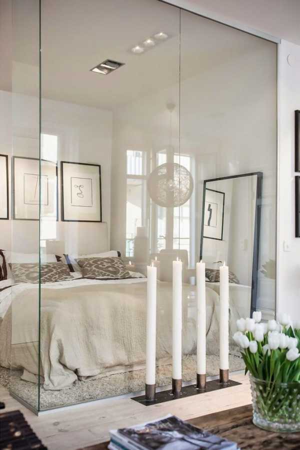 Не всегда представляется возможным отделить полноценной стеной спальную зону от гостевой, особенно если это студия или маленькая однокомнатная квартира. Но стоит только поставить стеклянную перегородку — и уединенный уголок готов.