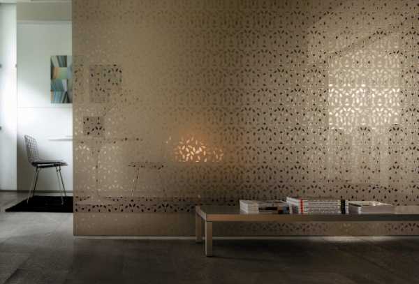 Межкомнатные перегородки могут изготавливаться из прозрачного, матового, тонированного или узорчатого стекла. Конструкция может быть из цельного листа или с использованием соединительных профилей. Для массивных и высоких перегородок используют прочное каленое стекло с толщиной 6-19 мм. Недостатком подобного стекла является его высокая стоимость.