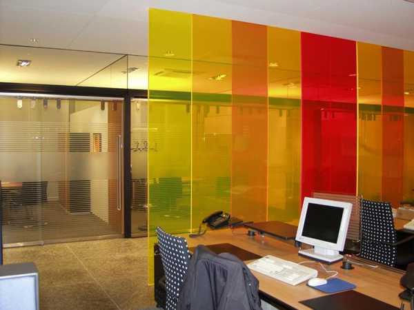 Комбинированная перегородка из цветного оргстеклаПолномерные или декоративные перегородки из стеклоблоков