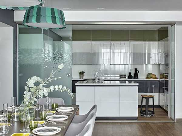 Этот прием также используют при объединении кухни с газовой плитой и гостиной/столовой. Для обеспечения безопасности помещение, в котором установлен газовый прибор, должно быть отгорожено и иметь двери. Но смысл объединения как раз и состоит в том, чтобы перегородку убрать. Это противоречие решается при помощи стеклянной мобильной стены. Ее полностью или частично делают из стекла, устанавливают раздвижные/складные двери.