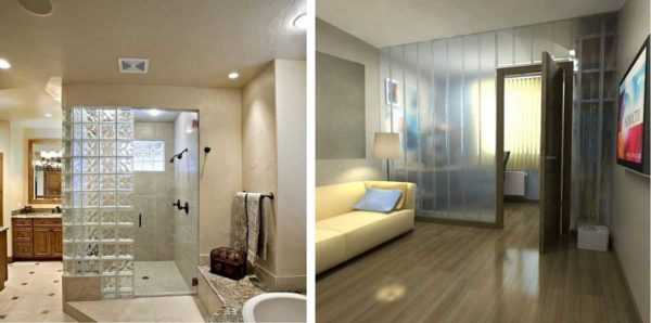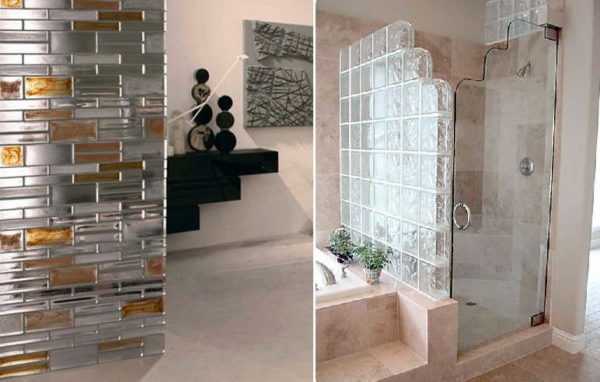Для создания стационарных прозрачных перегородок используют стеклоблоки или стеклопрофилит, отличающиеся друг от друга внешним видом и технологией производства. Блоки из стекла для перегородок не являются полностью прозрачными, что делает их хорошим материалом для обустройства санузлов и стен помещений в общественных местах, поскольку сквозь них можно рассмотреть только силуэты – даже если имеется отличное искусственное освещение.