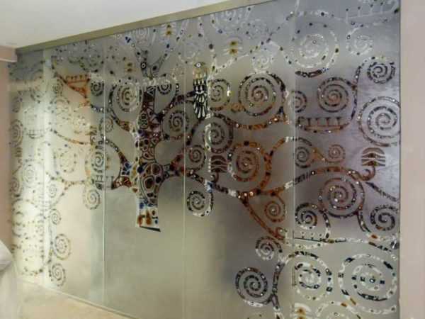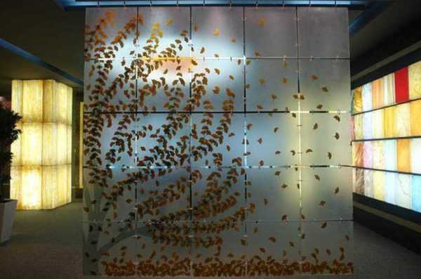 Для организации таких перегородок применяются каленое стекло и фурнитура, разрешающая прикрепить его к полу, потолку и стенам. В результате возникает стенка из стекла, которую, при необходимости, можно снабдить такой же дверью. Добавить индивидуальности такому барьеру способны различные рисунки. Это может быть графический орнамент или изображения растений. Художники способны реализовать даже самые необычные идеи хозяев.