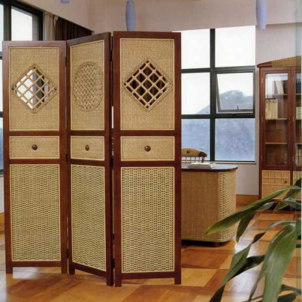 Самый распространенный вид переносных перегородок – ширмы. Такая конструкция создается из нескольких деревянных или металлических рам, пространство в которых заполняется тканью или другими материалами.