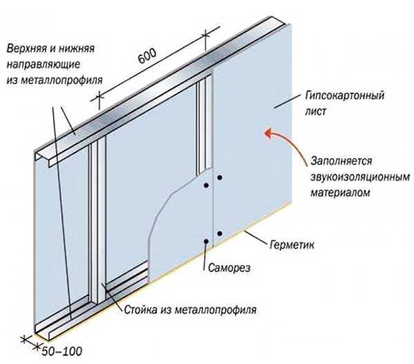 - Применяйте двухслойную или трехслойную облицовку гипсокартоном. За аналог возьмите конструкцию перегородки Knauf С112 или С113.