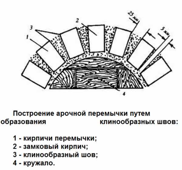 - Арочные. Кирпичные блоки укладывают аналогично клинчатой технологии. Расположение верхних швов идет под прямым углом к арке и наружной стороне переборки. Все остальные по форме напоминают клин: они сужаются книзу.