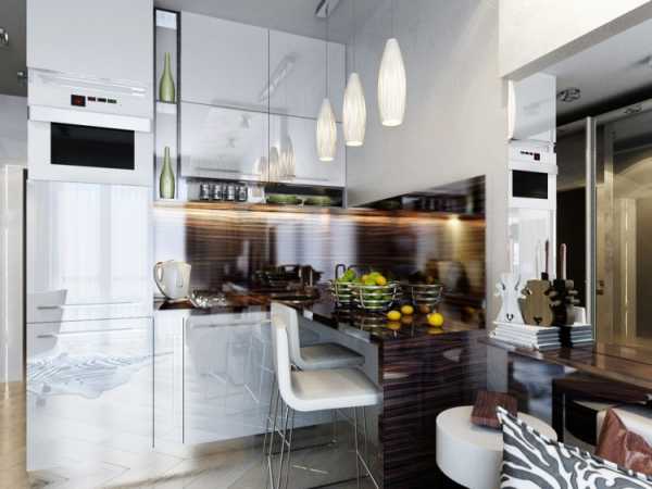 - Кухонную зону сделайте максимально глянцевой, а еще светлой. Это тоже увеличит помещение. Зеркальные вставки или подсветки придадут особый шик и сыграют добрую службу.