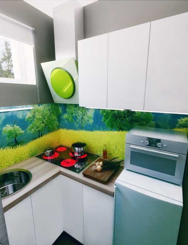 Встроенная мини-кухня с минималистичным дизайном и ярким фартуком
