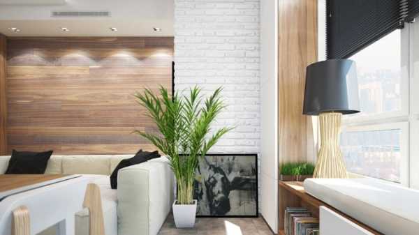 С одной стороны помещения находится светлая кухня, напротив — большой модульный диван. Зона «столовой» зрительно отделена декоративным стенным оформлением из тонких деревянных панелей. Центром комнаты смотрится окно, где располагается уютный уголок для чтения.