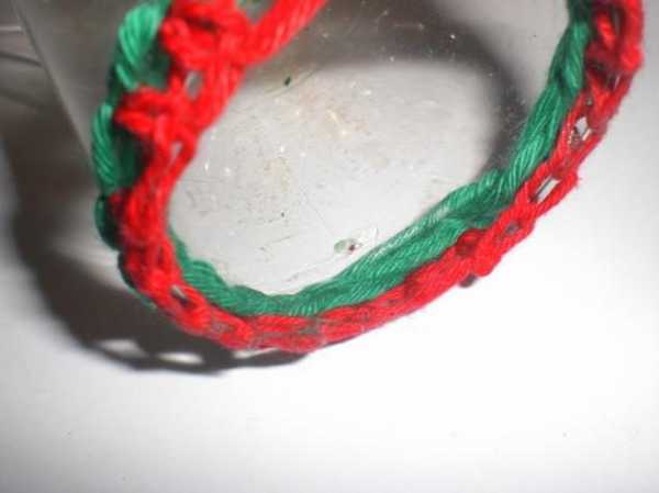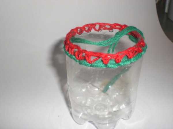 Немного оплавим края бутылки, чтобы избежать порезов рук при ее дальнейшей обработке. Бутылку следует держать на расстоянии 0,5-1см от пламени, равномерно поворачивая. Неровность краев после тепловой обработки скроет обвязывание крючком.