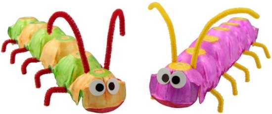 Интересным вариантом для поделки с маленькими детьми является гусеница (сороконожка). Для её изготовления нужно отрезать от лотка ряд из 5-6 ячеек, раскрасить, украсить ленточками, ниточками. Усики и лапки можно сделать из синельной проволоки. Немного фантазии, ярких красок и игрушка готова.