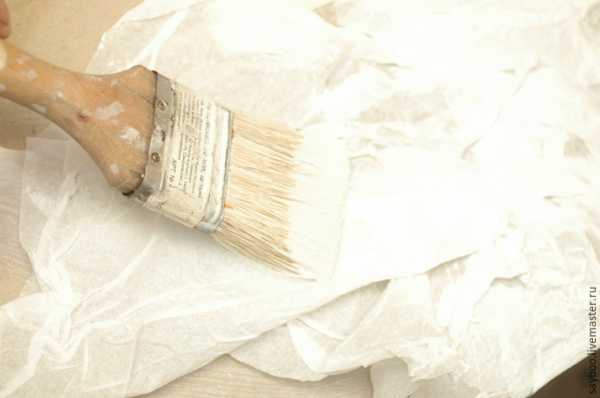 Я использовала обычный клей ПВА в смеси с акриловой белой краской 2:1, наносим поверх обычных салфеток. Таким образом создается неоднородная фактура и грунтовка поверхностей нашей заготовки.
