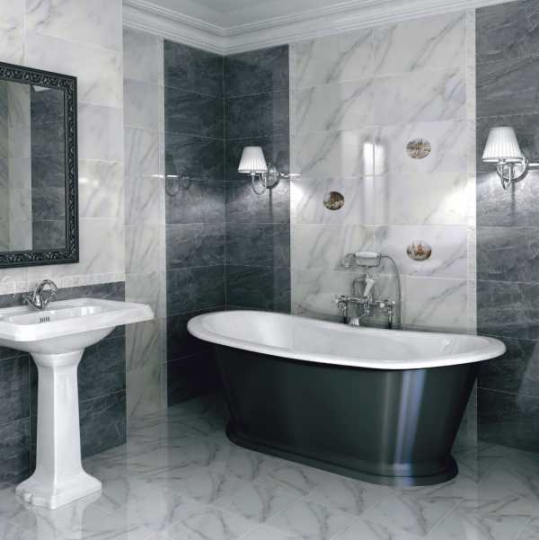 Беломраморные купальни известны еще с античности. Такой дизайн – классический атрибут роскоши. Керамогранит более доступен, однако отполированные до зеркального блеска плитки выглядят шикарно.