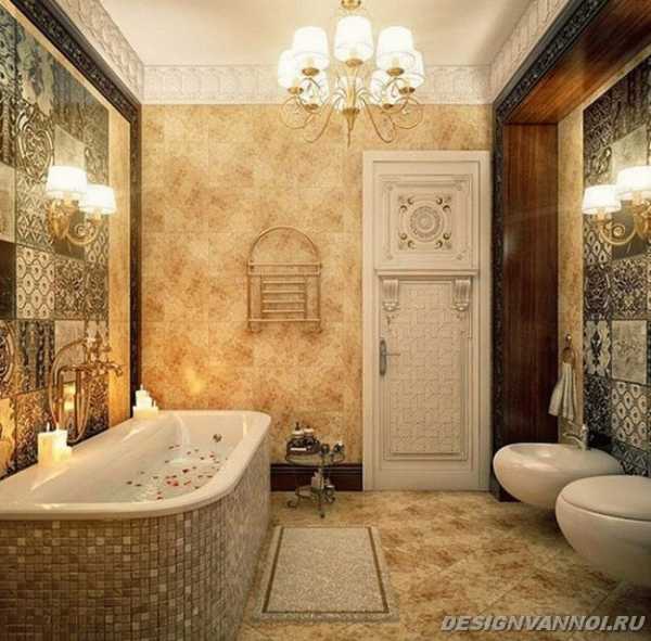 Вставка плиток иной фактуры или расцветки – удачный композиционный прием в дизайне ванной в классическом стиле