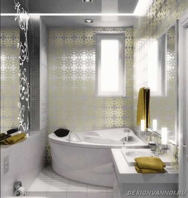 Если у вас стоит угловая ванная, ее форму можно «перенести» на потолочную поверхность и при помощи гипсокартона выложить круг, который будет контрастен по цвету со стенами, и остальной частью потолка. Также можно выделить гипсокартоном один угол комнаты — там, где стоит ванная или умывальник, а всю остальную территорию отдать «во власть» натяжного потолка.